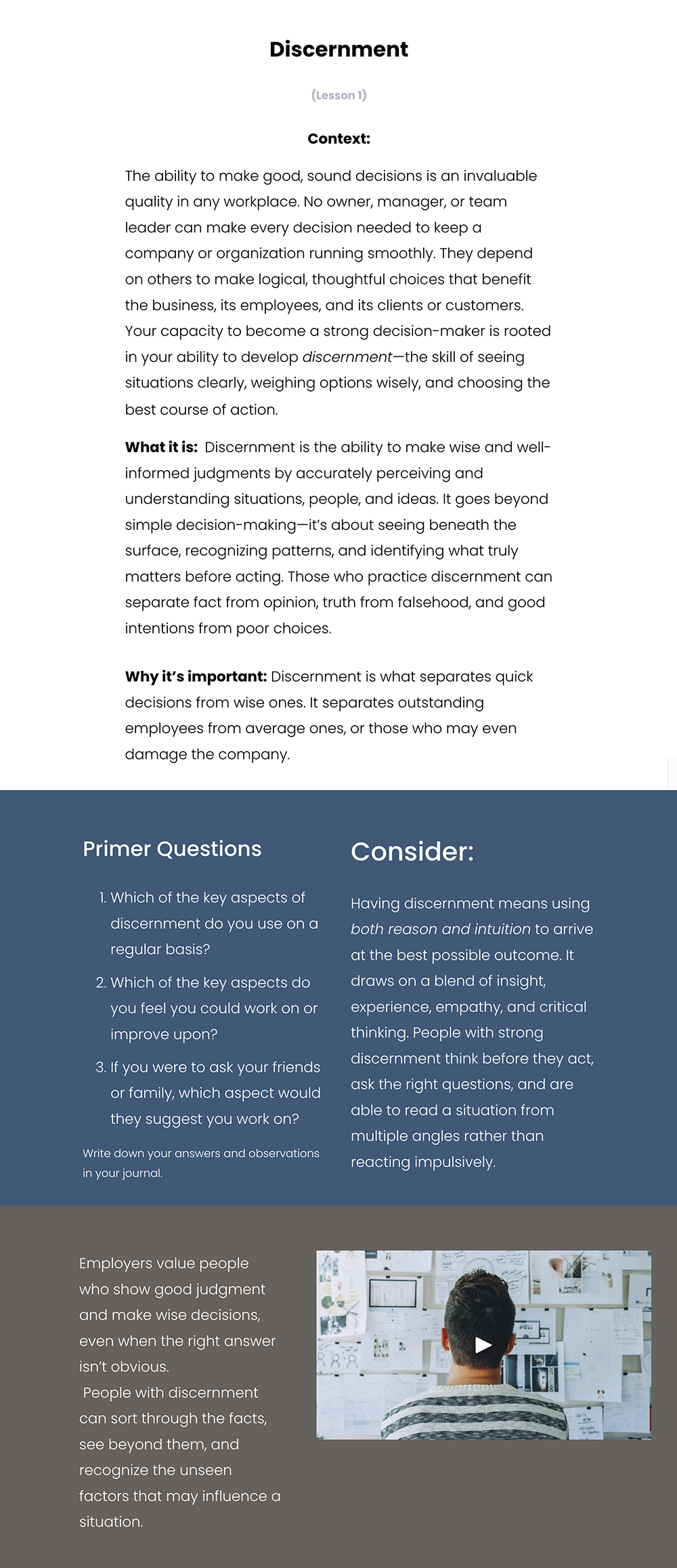 In our eight-week program, we usually begin with Refactoring lessons. These lessons help students recognize habits developed in traditional school settings that may unintentionally work against the durable skills needed to perform at a high level in the workplace.
